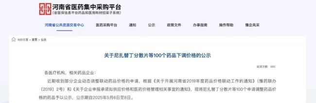 附1:河南关于尼扎替丁分散片等100个药品下调价格的公示