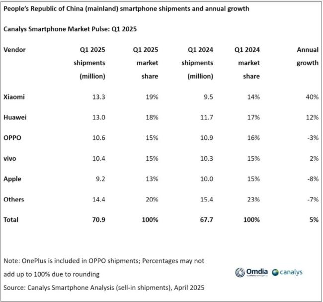 中低端市场竞争同样白热化。小米、OPPO、vivo等厂商纷纷加码性价比市场,Redmi K70系列、一加Ace 3等机型在2000-3000元价位段展开激烈厮杀,荣耀X系列和数字系列虽然保持了一定竞争力,但利润空间正在被持续压缩。Canalys分析师朱嘉弢在接受媒体采访时指出,“2025年第一季度,荣耀在国内市场的出货量约为900万部,以微弱差距位居苹果之后。这一市场表现波动主要源于两方面压力:一方面,在线下渠道遭遇OPPO、vivo等品牌的强势竞争;另一方面,随着华为供应能力的持续恢复,部分与华为用户群高度重合的消费群体正在流失。”