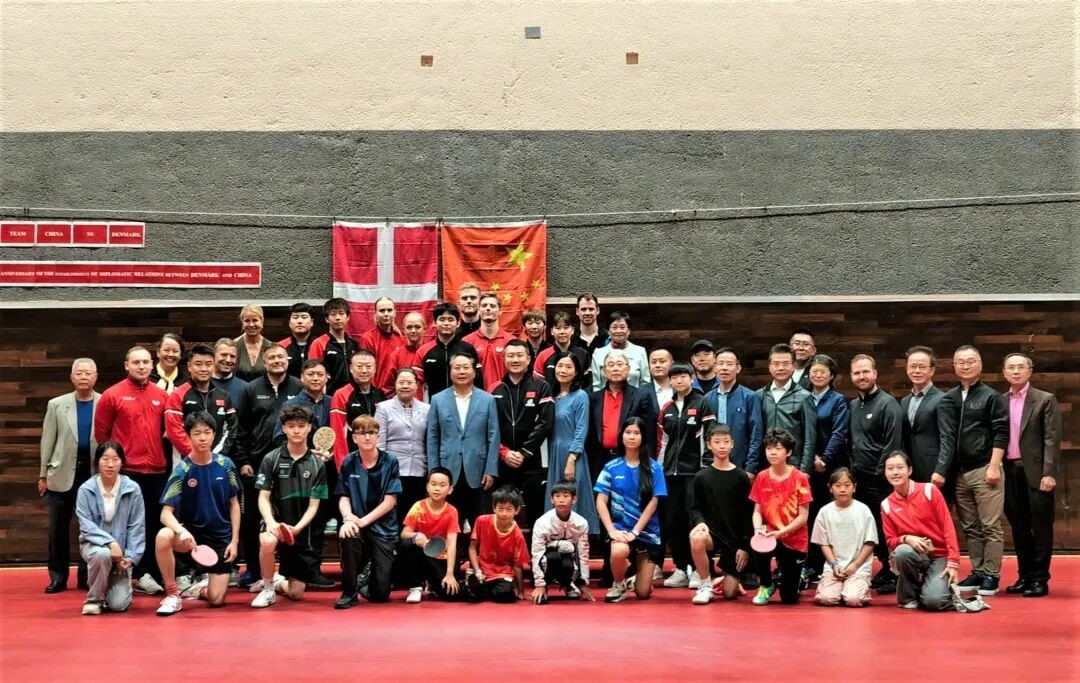 中丹乒乓球运动员交流互动。中国驻丹麦大使馆供图