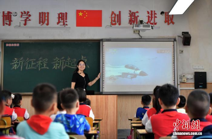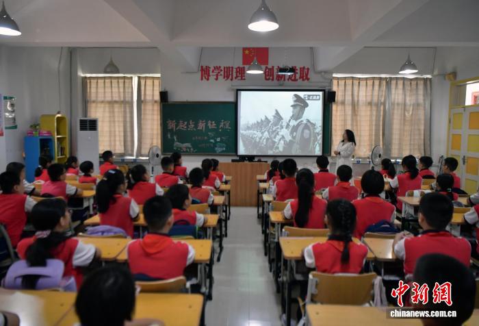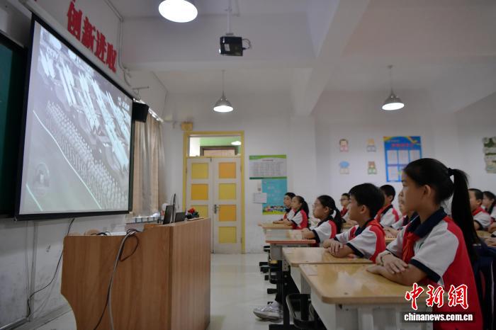 9月3日,河北省石家庄市育才小学,学生正在观看纪念中国人民抗日战争暨世界反法西斯战争胜利80周年大会的直播盛况。中新社记者 翟羽佳 摄