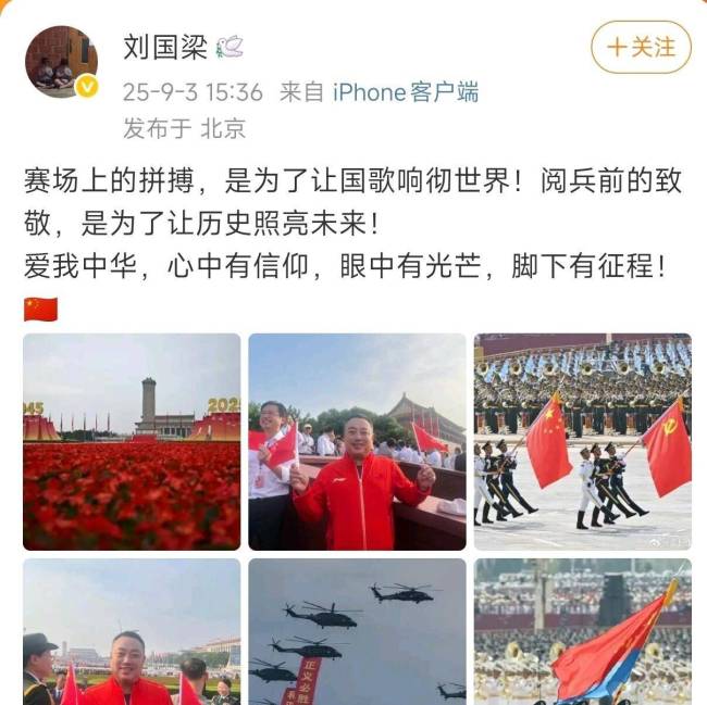 刘国梁观看阅兵后发文 19字箴言引发热议!刘国梁受邀出席在北京天安门广场举行的盛大阅兵仪式,这是他自今年4月卸任中国乒协主席后首次公开亮相重大国家活动。他在社交媒体平台上分享了阅兵心得:“赛场上的拼搏,是为了让国歌响彻世界!阅兵前的致敬,是为了让历史照亮未来!”其中“爱我中华,心中有信仰,眼中有光芒,脚下有征程”这19个字尤为引人注目,被网友形容为“铿锵有力,掷地有声”,在网络上引发热议。许多网友感叹“刘主席回来了”,仿佛又看到了当年在国乒运动员面前训话的那个刘主席。