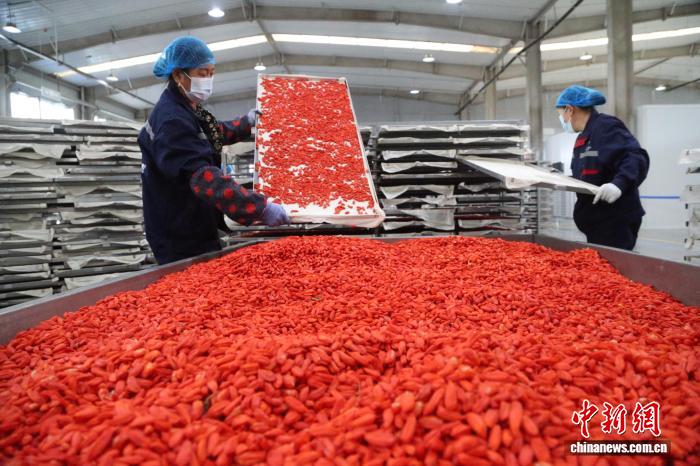 9月4日,青海省海西蒙古族藏族自治州格尔木市种植的柴达木枸杞迎来丰收季。图为工人在枸杞加工车间作业。张忠苹 摄