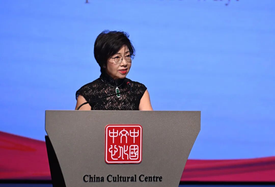 中国文化中心创会理事、南洋艺术学院董事会主席刘心玲在活动现场致辞。新加坡中国文化中心供图