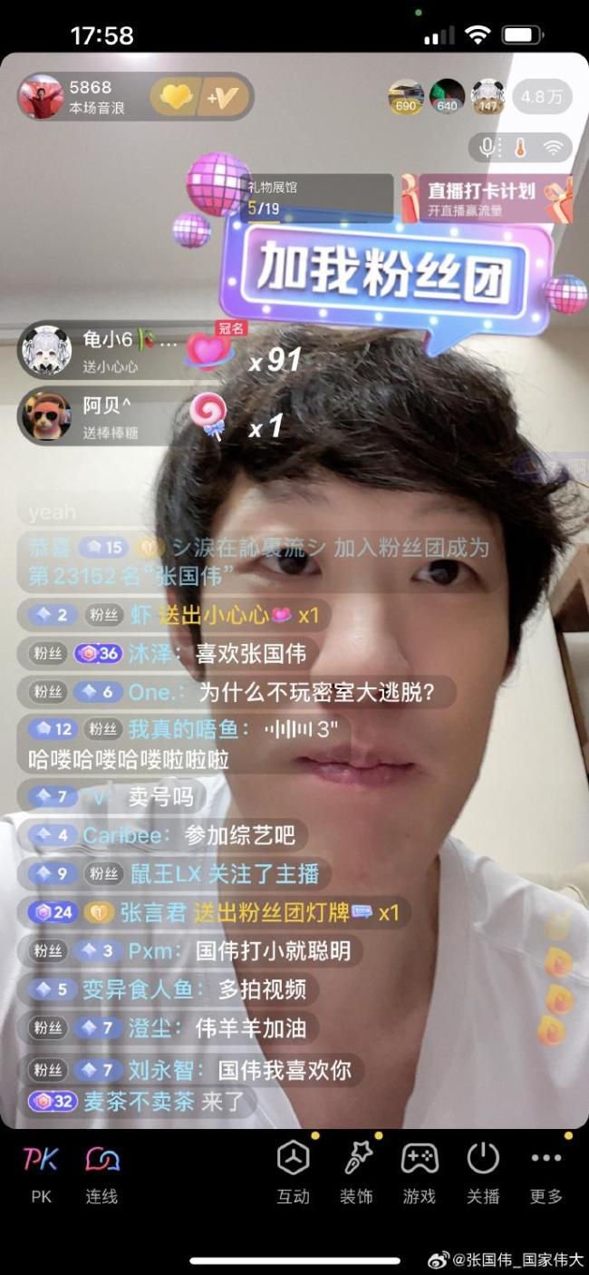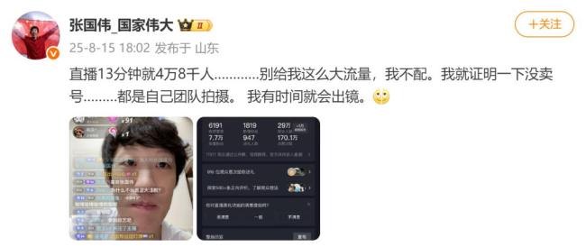8月15日,张国伟在直播中回应了卖号传闻,表示永远不会卖号,并承诺即使忙碌也会通过团队为大家带来欢乐。当晚,他在微博上发文称,直播短短13分钟就有4万8千人观看,让他感到压力巨大。次日上午,“张国伟回应卖号传闻”话题登上微博热搜榜。随后,张国伟再次发微博表示,流量高并非好事,希望大家关注更多优秀的直播和作品。