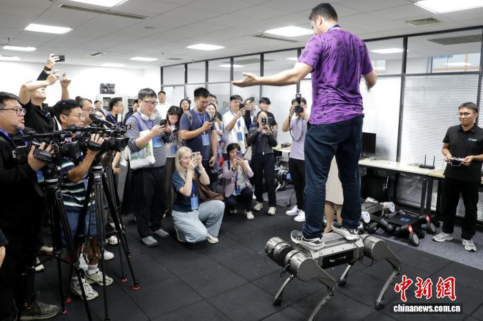 9月17日至19日,国务院新闻办公室组织30余名记者赴山东省采访推进黄河流域生态保护和高质量发展情况。图为,外国记者在济南优宝特机器人体验四足机器人承重实验。李欣 摄