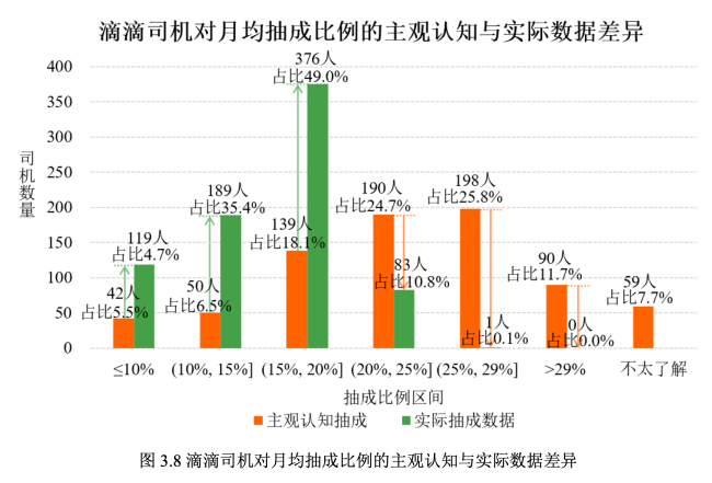 调研发现,71.8%的滴滴司机高估了抽成比例。超三分之一的司机误认为月均抽成高于25%,但以拍照留存的数据验证,768位司机中仅有1人月均抽成超过25%。