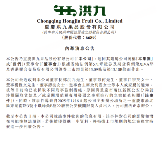 2025年5月22日,洪九果品更新了重庆市两江新区公安分局对公司涉嫌骗取贷款及╱或虚开增值税专用发票进行的立案调查的进展。