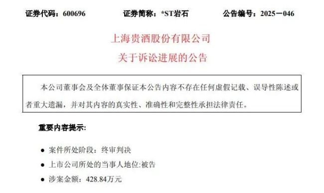 10月10日,上海贵酒股份有限公司(证券简称:ST岩石,股票代码:600696.SH,以下简称“岩石股份”)披露诉讼终审判决,因侵害贵州贵酒集团商标权及不正当竞争行为,被判赔偿418.85万元并立即停用“贵酒”企业名称。