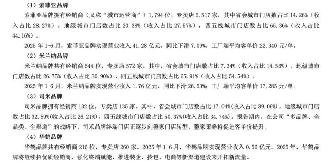 更需要注意的,今年上半年,索菲亚旗下的主要品牌营业收入也下降明显。其中,索菲亚品牌实现营业收入41.28亿元,同比下滑7.09%,工厂端平均客单价为22340元/单;米兰纳品牌营业收入为1.76亿元,同比下滑26.53%,工厂端平均客单价为17285元/单。