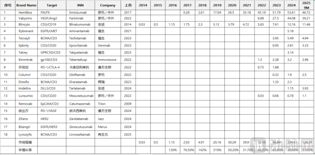 强生则通过EGFR/cMET双抗Rybrevant在实体瘤中快速崛起。Rybrevant是全球首款EGFR/c-MET双抗,于2021年获FDA加速批准上市,用于治疗铂类化疗进展后的携带EGFR外显子20插入突变的晚期或转移性NSCLC患者。通过同时抑制EGFR和c-MET两条通路,Rybrevant展现出了良好的抗肿瘤活性。2025年,Rybrevant处于快速放量阶段,预计全年超过7亿美元。此外,强生在血液瘤领域也有布局,2款血液瘤双抗预计全年合计销售额超过10亿美元。强生在临床开发上注重产品的疗效和安全性,通过严格的临床试验设计和数据分析,确保产品的质量。在商业化方面,强生利用其强大的品牌影响力和全球营销网络,迅速将产品推向市场,提高产品的市场占有率。