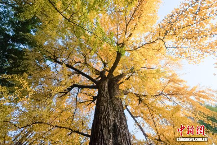 11月24日,初冬暖阳下,四川省眉山市东坡区纱縠行南街的三苏祠博物馆南门内,高大的银杏树渐染金黄,金黄叶片随风轻舞,吸引不少游客驻足观赏、拍照留念,现场洋溢着浓浓的诗意与雅致氛围。图为三苏祠内上百年的古银杏树渐染金黄。中新社记者 刘忠俊 摄