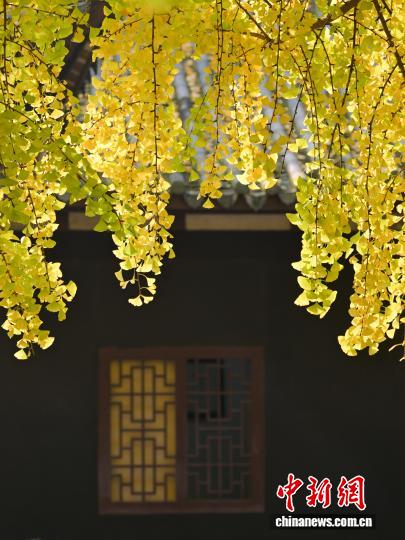 11月24日,初冬暖阳下,四川省眉山市东坡区纱縠行南街的三苏祠博物馆南门内,高大的银杏树渐染金黄,金黄叶片随风轻舞,吸引不少游客驻足观赏、拍照留念,现场洋溢着浓浓的诗意与雅致氛围。图为渐黄银杏和三苏祠古建筑。中新社记者 刘忠俊 摄