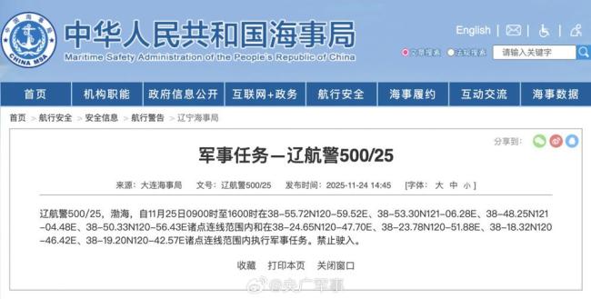 大连海事局发布航行警告,自11月25日9时至16时,渤海部分海域执行军事任务;自11月25日8时至28日12时,黄海北部部分海域实弹射击,禁止驶入。