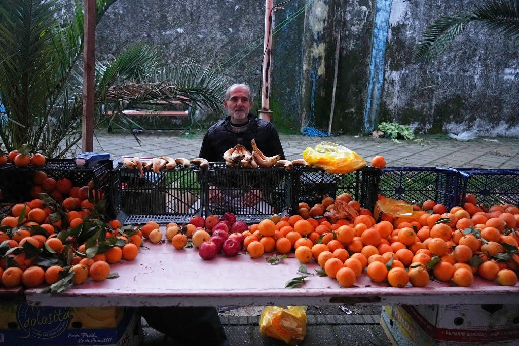 当地时间2025年12月25日,伊朗里海南部海岸,港口城市安扎利,一名小贩在传统的周四街头市场等待顾客。视觉中国图