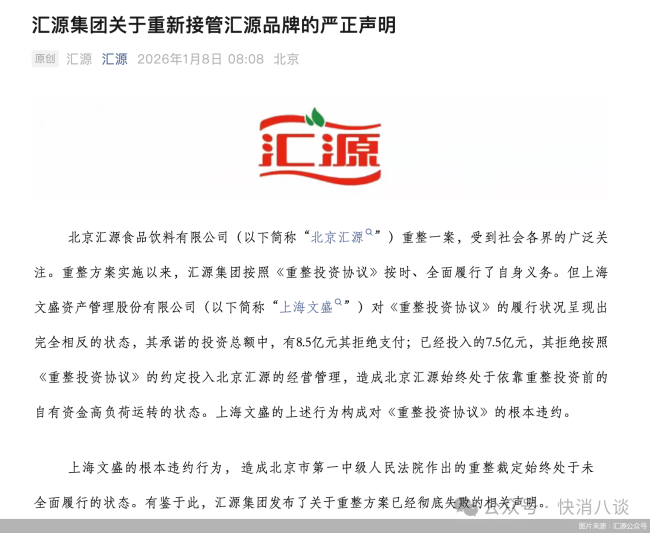 1月8日,汇源集团在声明中提到,北京汇源重整一案,受到社会各界的广泛关注。重整方案实施以来,汇源集团按照《重整投资协议》按时、全面履行了自身义务。但同时,上海文盛资产管理股份有限公司(以下简称“上海文盛”)承诺的投资总额中,有8.5亿元拒绝支付,已经投入的7.5亿元,拒绝按照《重整投资协议》的约定投入北京汇源的经营管理,造成北京汇源始终处于依靠重整投资前的自有资金高负荷运转的状态。