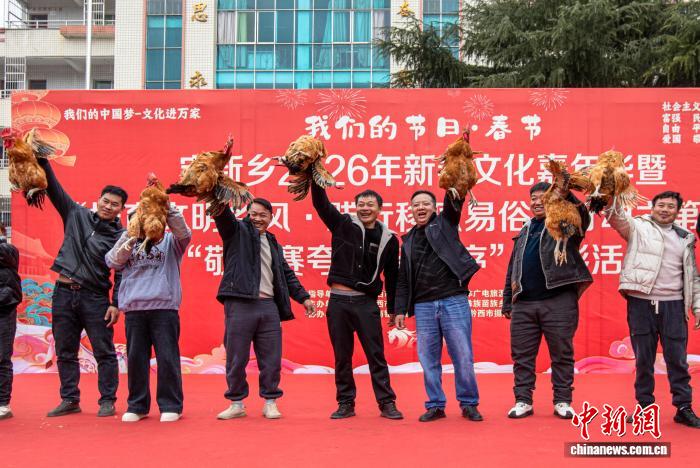 图为2月12日,贵州省黔西市定新彝族苗族乡迎春活动现场,拔河胜出队伍展示奖品。史开心 摄