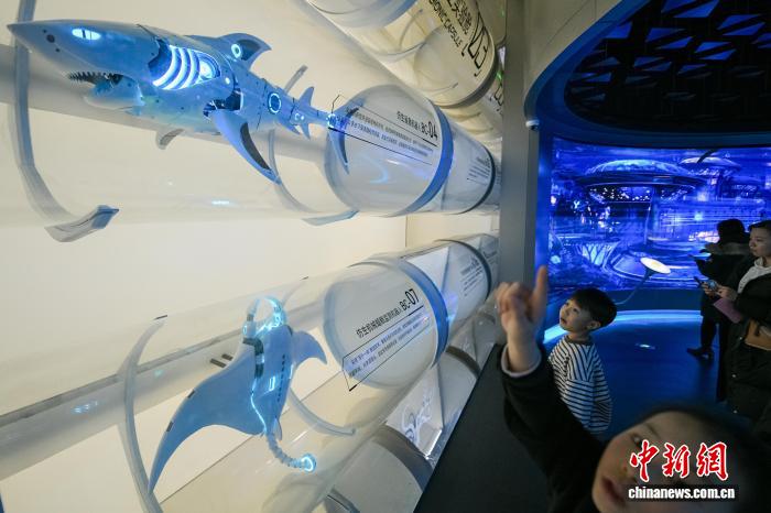 1月30日,游客在位于天津滨海新区的国家海洋博物馆“未来海洋”展厅参观各种海洋仿生机器人。中新社记者 佟郁 摄