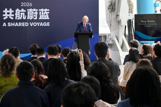 4月8日,美国桥水投资公司创始人达利欧在“共航蔚蓝”中美青年友谊行活动闭幕式上发言。新华社记者 陈浩明 摄