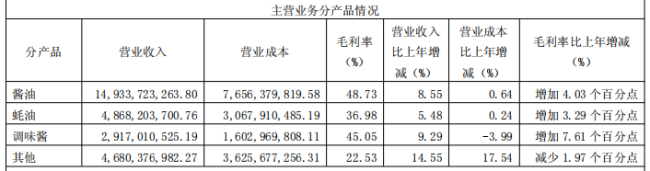 蚝油品类全年实现营收48.68亿元,同比增长5.48%,以超50%的市占率稳居行业第一,领先第二名李锦记超30个百分点,在蚝油赛道形成了近乎垄断的优势,成为公司稳定的利润来源。