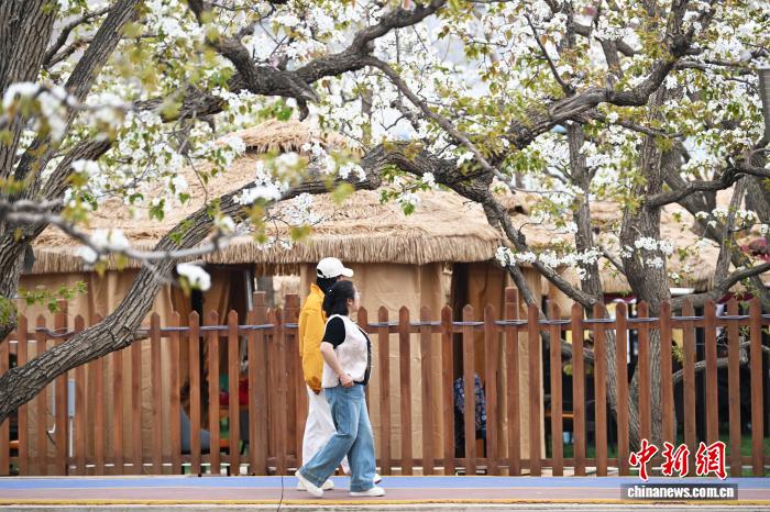 4月12日,位于甘肃省兰州市皋兰县什川古镇的万亩百年古梨园花开吸引游人踏青拍照。中新社记者 李亚龙 摄