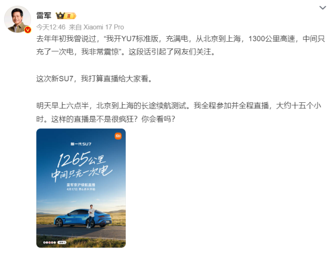 速途网4月16日消息,今日,雷军于微博个人账号发文,表示将于明早6点半开启一场长达15个小时的直播,进行新SU7从北京到上海的长途续航测试,自己会全程参加并全程直播。