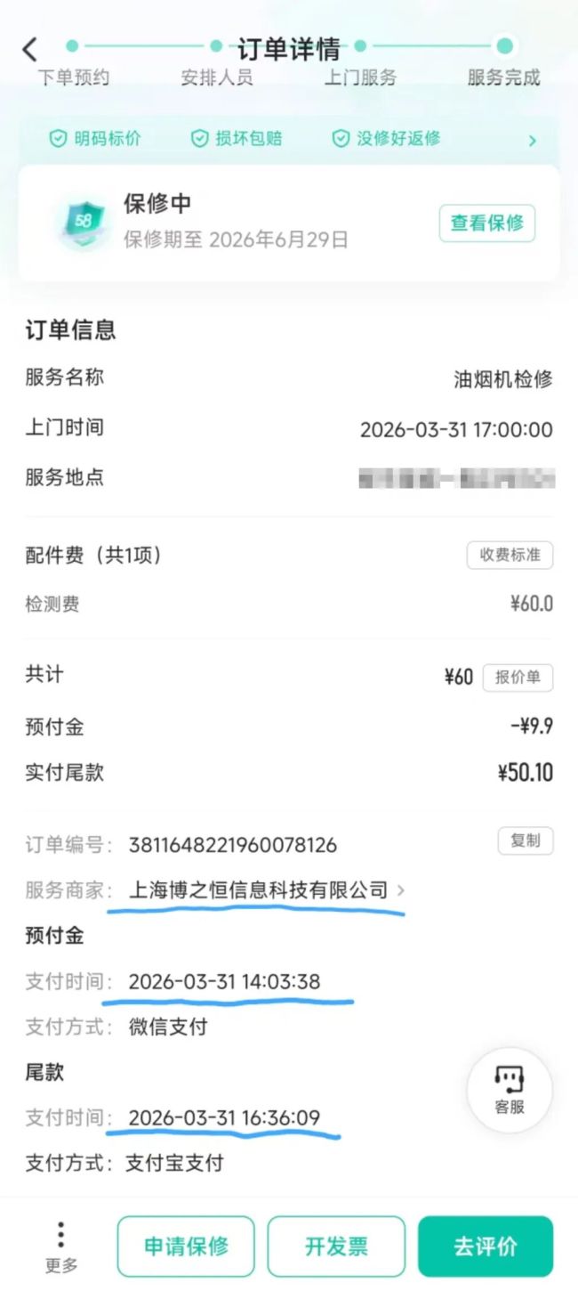 近期有消费者在58同城下单维修家电时,遇到了两名来自不同公司的师傅上门维修的情况,平台上还莫名多出一个订单。沈女士向媒体介绍,事发当日15时30分左右,第一位师傅上门维修后收取了839元费用;16时15分许,第二位身着58同城工服、带有工牌的师傅上门,这位师傅才是来自沈女士所下单的“博之恒”公司。随后,她在58同城APP“维权投诉中心”找到了另一个“幽灵订单”,商家是“闪修速修上海总店”。