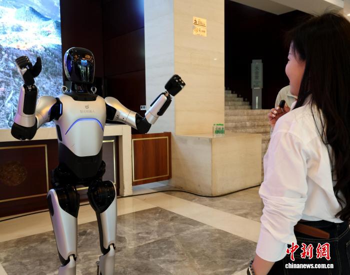 参会嘉宾在现场与人形机器人互动。赵晓 摄