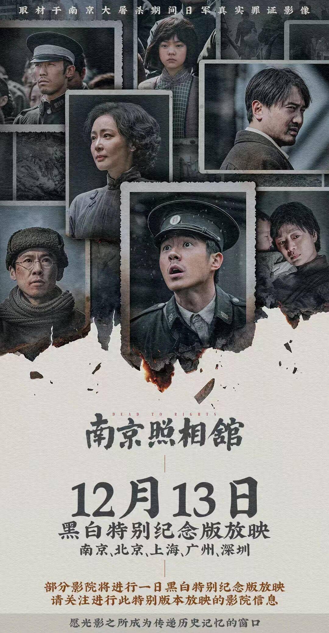 12月13日将特别放映《南京照相馆》。据@电影南京照相馆消息,12月13日,电影《南京照相馆》黑白特别纪念版将开启一日放映,在南京、北京、上海、广州、深圳5座城市的40家影院与影迷见面。据悉,将上映的南京16家影院覆盖南京所有区。在南京大屠...