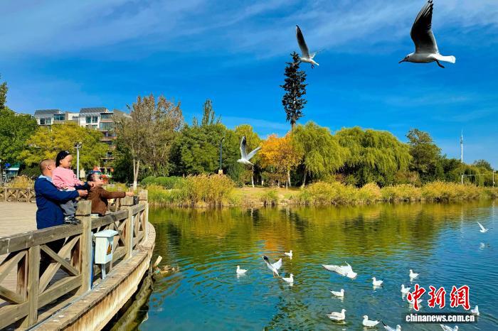 中新网银川10月15日电 (记者 李佩珊)深秋时节,宁夏银川湖泊湿地波光潋滟,成千上万只红嘴鸥时而掠过水面,时而盘旋空中,与岸边驻足观赏的游客构成一幅和谐动人的画面。不远处的滩涂上,几只素有“鸟中大熊猫”之称