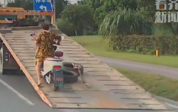 女子骑电动车冲上路边拖车 拖车:公主请上车详情