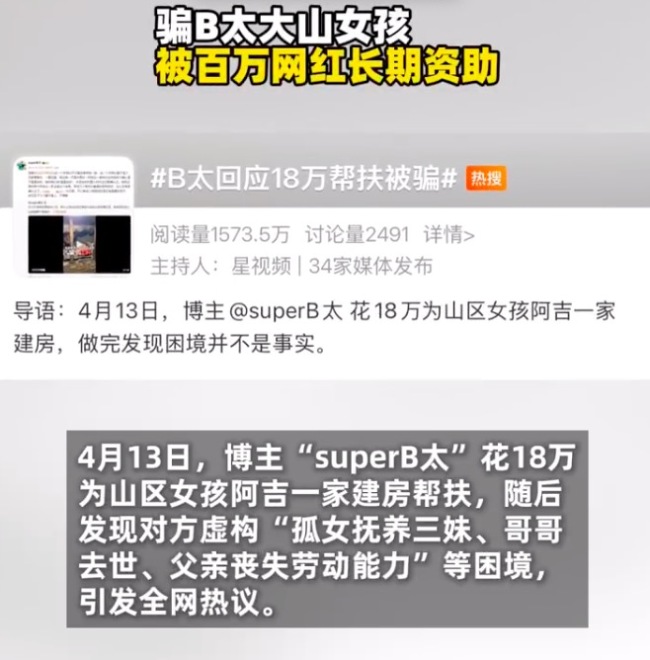 4月13日,博主@superB太花18万为山区女孩阿吉一家建房帮扶,随后发现对方虚构“孤女抚养三妹、哥哥去世、父亲丧失劳动能力”等困境,引发全网热议。据悉,另一百万博主“澳门老炮”也曾帮扶过阿吉一家,为其建造房子提供资助,并认其中一女孩为干...