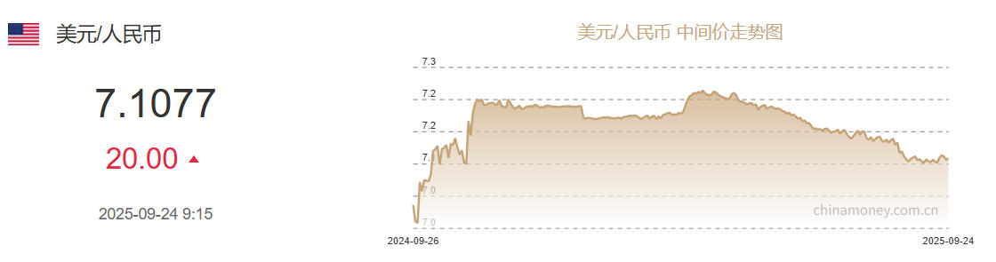 9月24日人民币对美元中间价报7.1077元 下调20个基点详情
