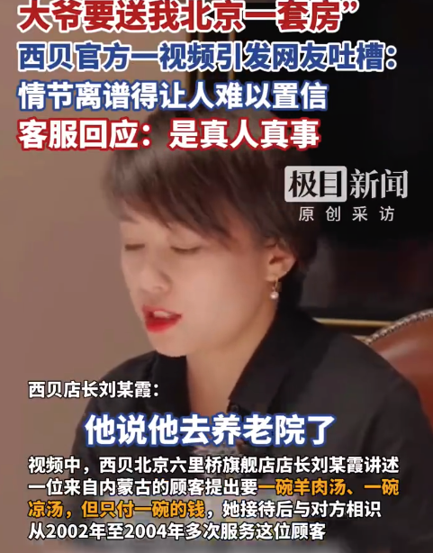 9月27日,“西贝回应一碗汤换顾客北京一套房”冲上热搜。据报道,有网友扒出一则西贝官方发布的视频《我给大爷一碗汤,大爷要送我北京一套房》,引发许多人吐槽。这则视频是网友“考古”挖出来的,事件已经过去20多年了。视频中,西贝北京六里桥旗舰店店...