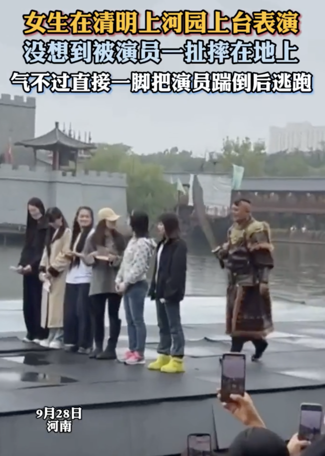 清明上河园:女生上台表演被演员扯摔在地上,详情